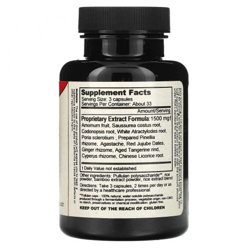 | Proprietary Extract Formula: Amomum fruit, Saussurea costus root, Codonopsis root, White Atractylodes root, Poria sclerotium, Prepared Pinellia rhizome, Agastache, Red Jujube Dates, Ginger rhizome, Aged Tangerine rind, Cyperus rhizome, Chinese Licorice root. | 1500 mg | † |
