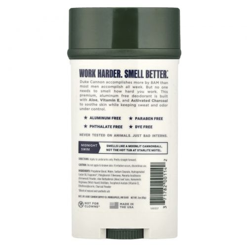 Duke Cannon Supply Co., Дезодорант без алюминия, Midnight Swim, морская трава и сандал, 85 г (3 унции)
