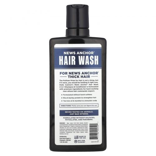 Описание товара Duke Cannon Supply Co., News Anchor®, средство для мытья волос, шампунь и кондиционер 2 в 1, Midnight Swim, морская трава и сандаловое дерево, 414 мл (14 жидк. Унций)