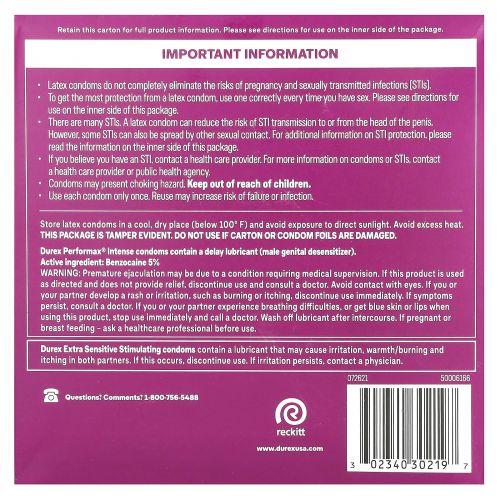 Храните латексные презервативы в сухом и прохладном месте (при температуре ниже 100 ºF) во избежание воздействия прямых солнечных лучей. Избегать чрезмерного нагревания. Упаковка защищена от вскрытия. не используйте, если картонная упаковка или фольга презерватива повреждены. Презервативы Durex Performax® Intense содержат смазку с задержкой (десенсибилизатор мужских половых органов). Активный ингредиент: Бензокаин 5%.