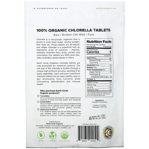 Описание товара Earth Circle Organics, 100% Organic Chlorella Tablets, 1,000 Tablets, 8.75 oz (248 g)