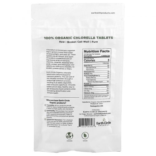 Описание товара Earth Circle Organics, Organic Chlorella Tablets, 250 mg, 400 Tablets, 3.5 oz (100 g)