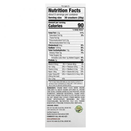 Органическая пшеничная мука, вода, органическое подсолнечное масло и/или органическое сафлоровое масло, органический тростниковый сахар, разрыхлитель (монокальцийфосфат, бикарбонат натрия, бикарбонат аммония), органический инвертный тростниковый сахар, органический глютен из пшеницы, натуральный ароматизатор, морская соль, органический солодовый экстракт, смесь витаминов и минералов, ортофосфат железа, никотинамид, оксид цинка, цианокобаламин, мальтодекстрин, фолиевая кислота, тиамина мононитрат, пиридоксина гидрохлорид, рибофлавин).