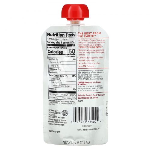 Описание товара Earth's Best, органическое пюре для детского питания, для детей от 6 месяцев, яблоко и клубника, 113 г (4 унции)