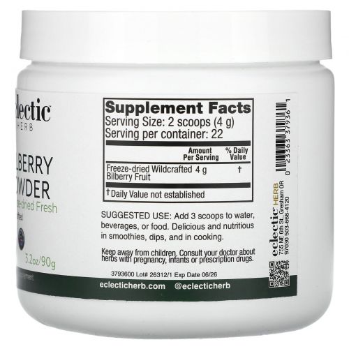 Описание товара Eclectic Institute, Порошок черники, сырой, 3,2 унций (90 г)