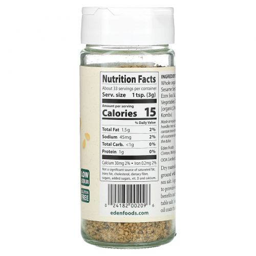 Натуральные высушенные жаркой семена кунжута, молотые с морской солью Эдем, и богатые минералами морские овощи комбу, дульсе и нори. Замена столовой соли. Масло кунжута покрывает соль, значительно сокращая ее резкий вкус. Низкое содержание натрия.