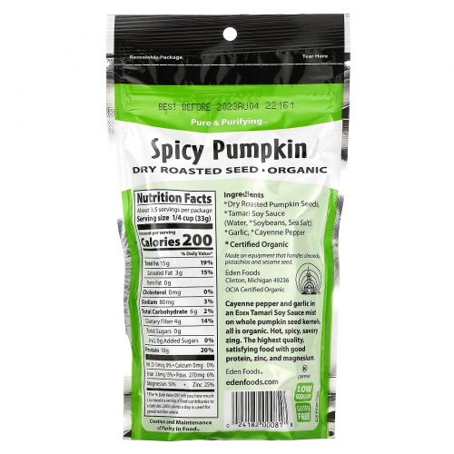 Описание товара Eden Foods, Сухие жареные семечки натуральной пряной тыквы, 4 унции (113 г)