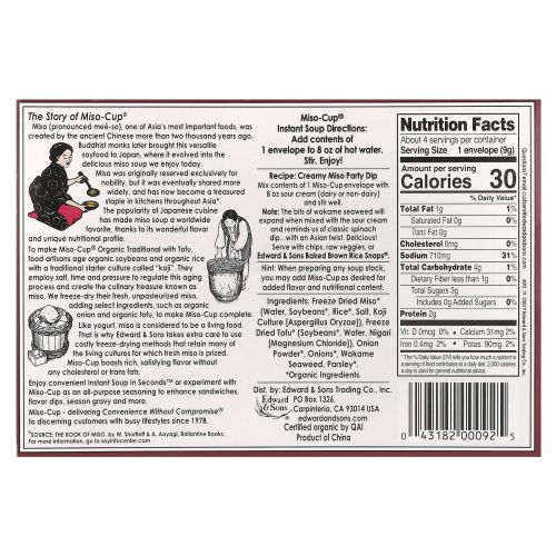 Как и йогурт, мисо считается живой едой. Вот почему Edward & Sons уделяет особое внимание дорогостоящим методам сублимации, позволяющим сохранить многие живые культуры, за которые ценится свежее мисо. Miso-Cup может похвастаться насыщенным, приятным вкусом без холестерина и трансжиров.