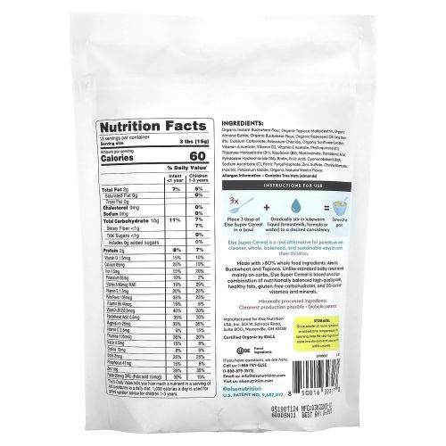 Сделано с >80% цельных пищевых ингредиентов: Миндаль, гречка и тапиока. В отличие от стандартных детских хлопьев, в основе которых лежат углеводы, Else Super Cereal состоит из уникального сочетания питательно сбалансированного высококачественного белка, полезных жиров, безглютеновых углеводов и более 20 незаменимых витаминов и минералов.