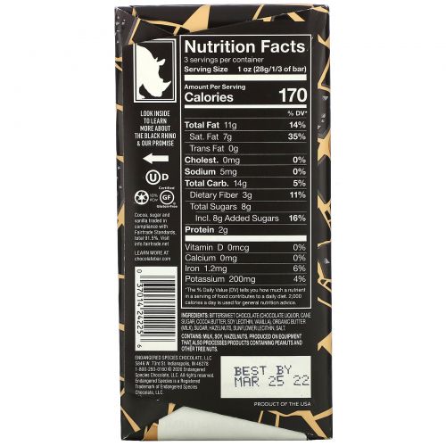 Описание товара Endangered Species Chocolate, Натуральный черный шоколад с фундуком, ирис, 3 унции (85 г)