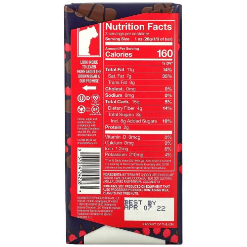 Описание товара Endangered Species Chocolate, Темный шоколад с малиной, 3 унции (85 г)