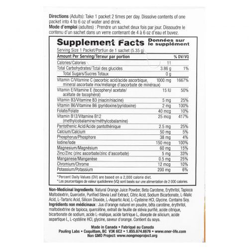 Non-Medicinal: Glycine, l-cysteine, tapioca maltodextrin, beta-carotene, sodium bicarbonate, natural orange juice powder, silicon dioxide, dl-malic acid, l-tartaric acid, citric acid, erythritol, purified stevia leaf extract, l-aspartic acid, quercetin.