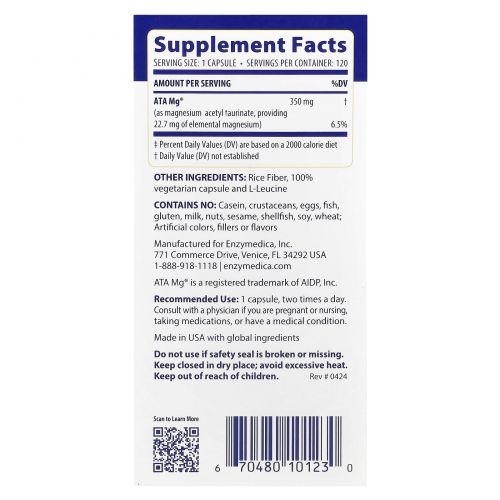 ATA MgⓇ - это запатентованная форма магния, в которой этот мощный минерал сочетается с таурином, аминокислотой, используемой организмом для передачи ионов магния в клетки.