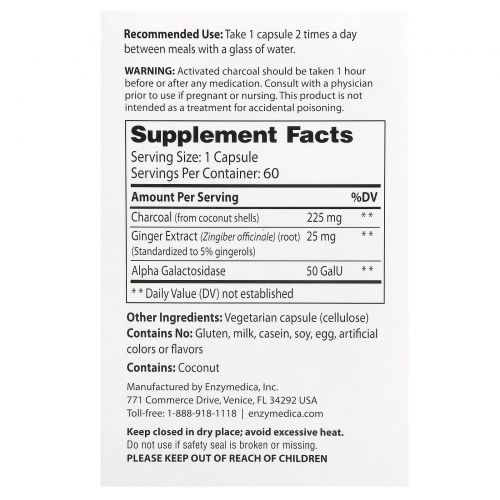 Описание товара Enzymedica, Очищение, активированный кокосовый уголь+, 60 капсул