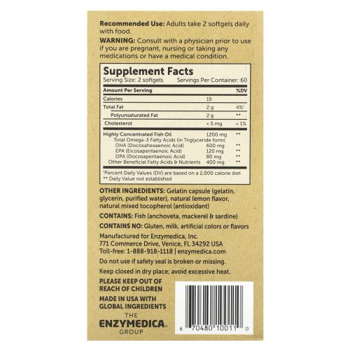 Описание товара Enzymedica, Омега-3, классическая сила, лимон, 600 мг, 120 мягких таблеток