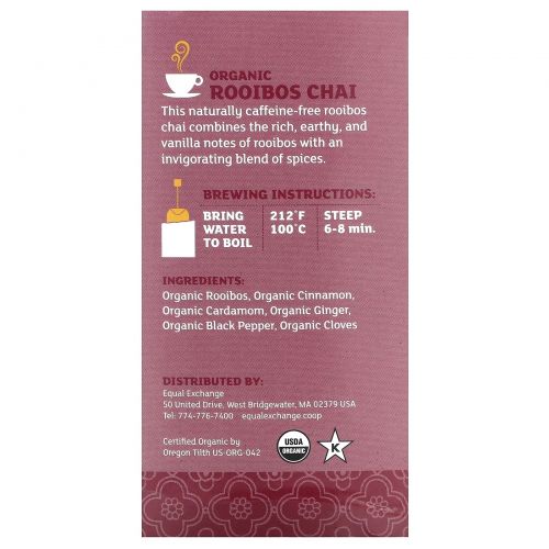 Описание товара Equal Exchange, Органический чай ройбуш, травяной чай, без кофеина, 20 чайных пакетиков, 40 г (1,41 унции)