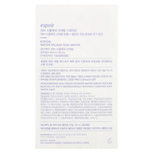 Описание товара Espoir, Water Splash Sun Serum, SPF 50+ PA +++ и все очищающее масло для макияжа, набор из 2 предметов