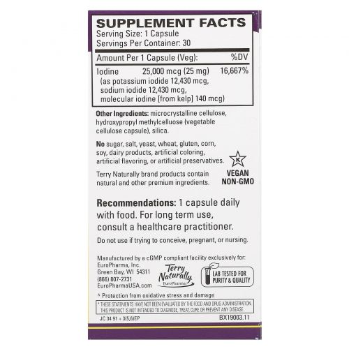 Описание товара EuroPharma, Terry Naturally, Terry Naturally, Tri-Iodine, 25 мг, 30 капсул