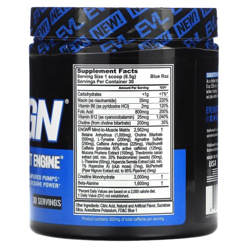 Описание товара EVLution Nutrition, ENGN Pre-workout Engine, Blue Raz Flavor, 9 oz (255 g)