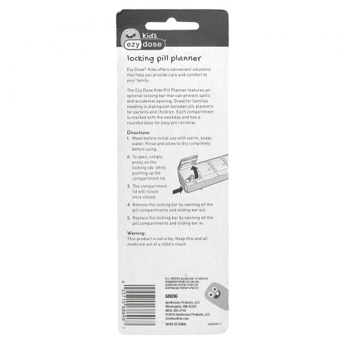 Детский органайзер для таблеток Ezy Dose имеет дополнительную планку с замком, которая предотвращает проливание и случайное открытие. Отлично подходит для семей, которым необходимо различать таблетки по планированию для родителей и детей. На каждом отделении указан день недели, а также закругленное дно для удобного извлечения таблеток.
