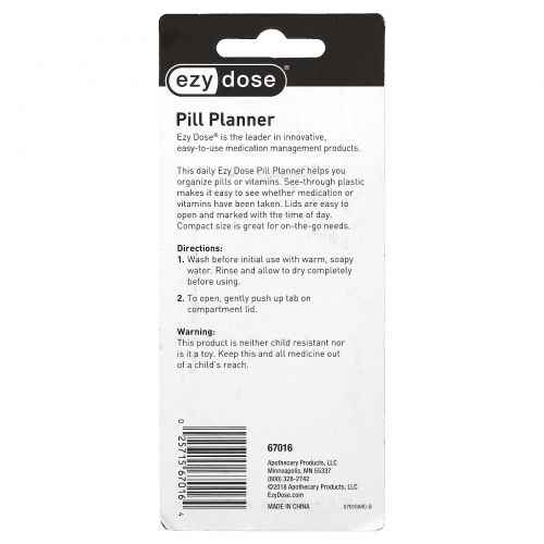 Этот ежедневный органайзер для таблеток Ezy Dose поможет вам систематизировать таблетки или витамины. Прозрачный пластик позволяет легко увидеть, были ли приемы лекарств или витаминов. Крышка легко открывать и отмечена временем суток. Компактный размер идеально подходит для использования в дороге.