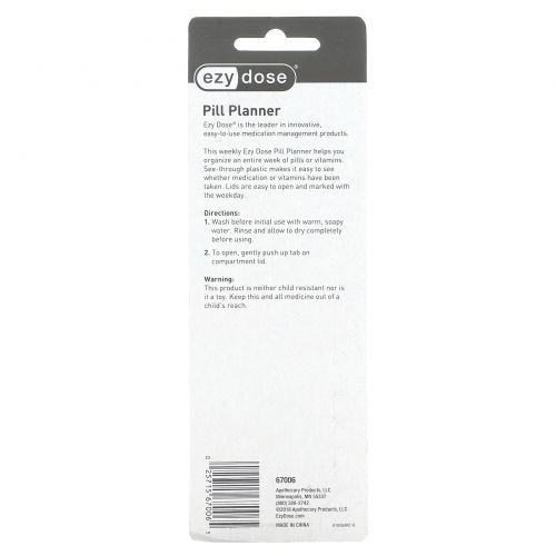 Этот еженедельный органайзер для таблеток от Ezy Dose поможет вам организовать прием таблеток или витаминов в течение всей недели. Прозрачный пластик позволяет легко увидеть, были ли приемы лекарств или витаминов. Крышка легко открывать и отмечена днем недели.