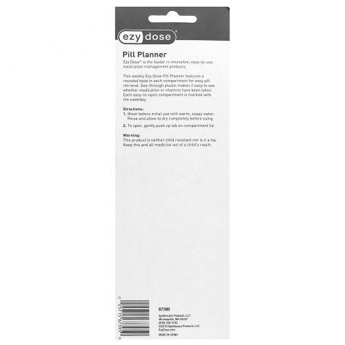 Этот еженедельный органайзер для таблеток Ezy Dose имеет закругленное основание в каждом отделении для удобного извлечения таблеток. Прозрачный пластик позволяет легко увидеть, были ли приемы лекарств или витаминов. На каждом легкодоступном отделении указан день недели.