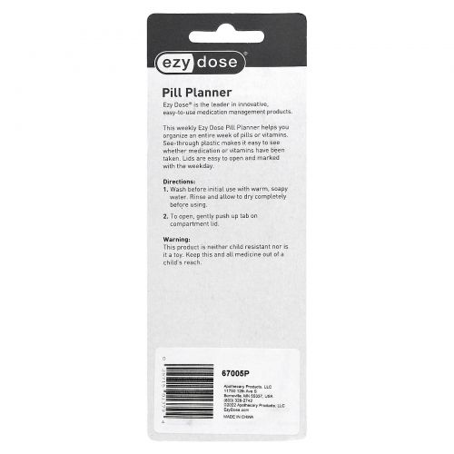 Этот еженедельный органайзер для таблеток от Ezy Dose поможет вам организовать прием таблеток или витаминов в течение всей недели. Прозрачный пластик позволяет легко увидеть, были ли приемы лекарств или витаминов. Крышка легко открывать и отмечена днем недели.