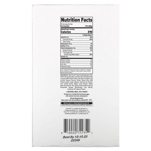 Глазурь из йогурта с высоким содержанием белка (сахар, пальмоядровое масло (получено из ответственных источников), пальмовое масло (полученное из ответственных источников), изолят молочного протеина, сухой обезжиренный йогурт, соевый лецитин, натуральные ароматизаторы), вода, пшеничная мука, изолят молочного протеина, сахар, аллюлоза, соевое масло, желатина, чистый ванильный экстракт, (вода, тростниковый спирт, экстракт стручков ванили), соль, разрыхлитель (монокальциевый фосфат, натрия, бикарбонат, кукурузный крахмал), подсолнечное масло, натуральные ароматизаторы.