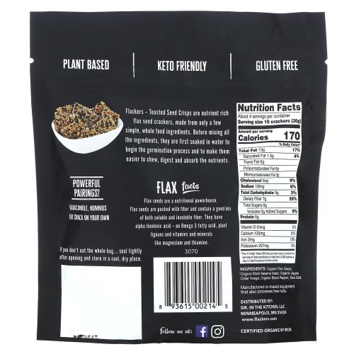 Описание товара Flackers, снеки из обжаренных семян льна, семена черного кунжута и черного перца, 128 г (4,5 унции)