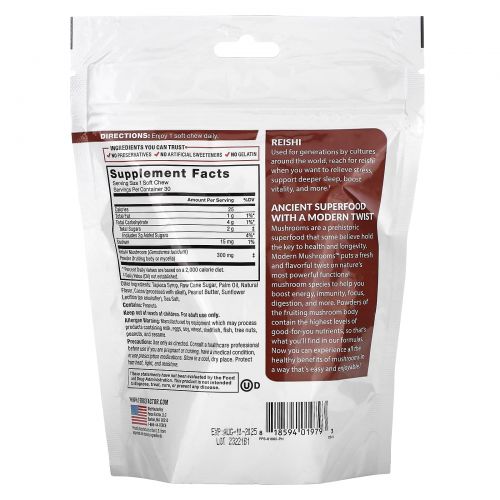 Описание товара Force Factor, Modern Mushrooms, рейши, шоколад и арахисовая паста, 30 жевательных таблеток с суперфудами