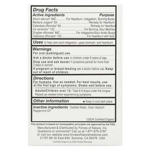 Описание товара Forces of Nature, изжога, органическое растительное средство, со вкусом мяты, 10 мл (0,34 жидк. унции)