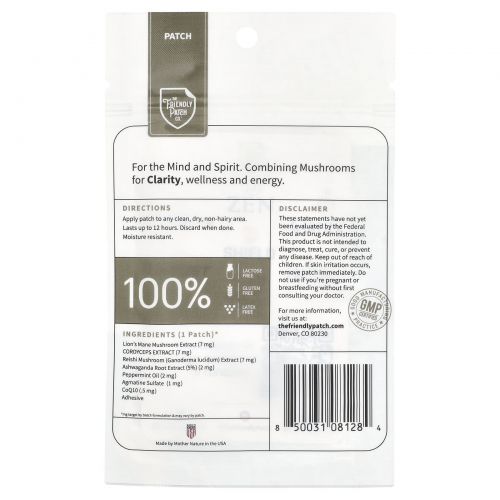 Другие Ингредиенты(1 патч) * - Экстракт гриба львиной (7 мг), экстракт кордицепса (7 мг), экстракт гриба рейши (Ganoderma lucidum) (7 мг), экстракт корня ашваганды (5%) (2 мг), масло перечной мяты (2 мг), агматинсульфат (1 мг), Клей с коэнзимом Q10 (0,5 мг).