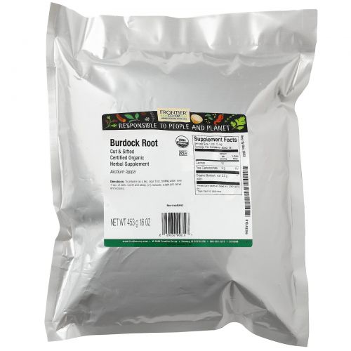 Описание товара Frontier Natural Products, Органический порезанный и просеянный корень лопуха, 16 унций (453 г)