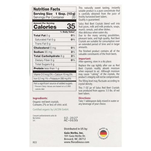 Это 7 унций. банка кристаллов красной свеклы Salus была изготовлена из ок. 5,5 фунтов. клубней красной свеклы.