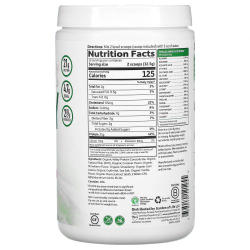 Описание товара Garden of Life, Органический сывороточный протеин из молока коров, выращенных на подножном корме, клубника, 13,88 унций (393,5 г)