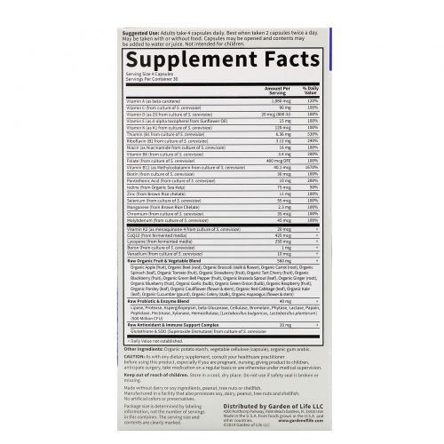 | Смесь необработанных органических фруктов и овощей Органическое яблоко (плод), органическая свекла (корнеплод), органическая брокколи (стебель и цветок), органическая морковь (корнеплод), органический шпинат (лист), органический томат (плод), органическая клубника (плод), органическая вишня (плод), органическая ежевика (плод), органический зеленый болгарский перец (плод), органическая брюссельская капуста (лист), органическая голубика (плод), органический имбирь (корень), органический чеснок (луковица), органический зеленый лук (луковица), органическая малина (плод), органическая петрушка (лист), органическая цветная капуста (цветок и стебель), органическая красная капуста (лист), органическая листовая капуста (лист), органический огурец (плод), органический сельдерей (стебель), органическая спаржа (цветок и стебель) | 560 мг | + |