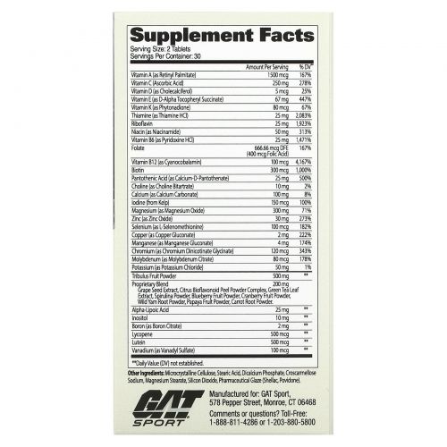 Mens Multi + Test — это полный комплекс витаминов, микроэлементов и энергетических мультивитаминов с добавленным ингредиентом для мужской силы якорцев стелющихся (Tribulus terristis). Комплекс GAT Mens Multi предлагает мужчинам, получающим регулярные физические нагрузки, полную компенсацию дефицита питательных веществ, в которой они могут иметь потребность, а также увеличение мужской силы и уровня тестостерона.