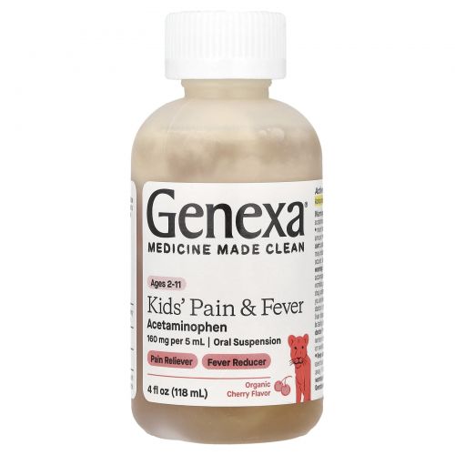 Описание товара Genexa, Kids 'Pain & Fever, для детей 2–11 лет, органическая вишня, 118 мл (4 жидк. унц.)