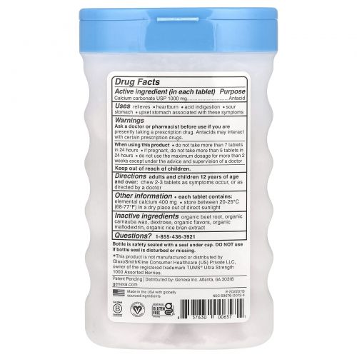 Описание товара Genexa LLC, антацид максимальной силы, органические ягоды и ваниль, 1000 мг, 72 жевательные таблетки