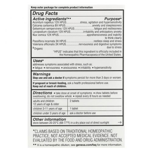 Описание товара Genexa LLC, Stress, органическая формула для снятия стресса и усталости, органические ваниль и лаванда, 60 жевательных таблеток