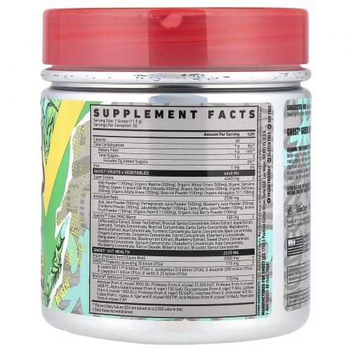 Добывать фрукты и овощи здесь просто как никогда! GHOST® GREENS сочетает в себе 19 зеленых и красных оттенков, полученных из отдельных источников, с полной дозой Spectra ™ (100 мг), пребиотиками, пробиотиками в 10 миллиардов КОЕ и комплексными пищеварительными ферментами BioCore® Optimum супер-премиального качества.