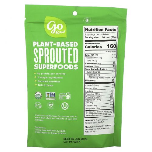 Описание товара Go Raw, Органические семена тыквы с морской солью, 113 г (4 унции)