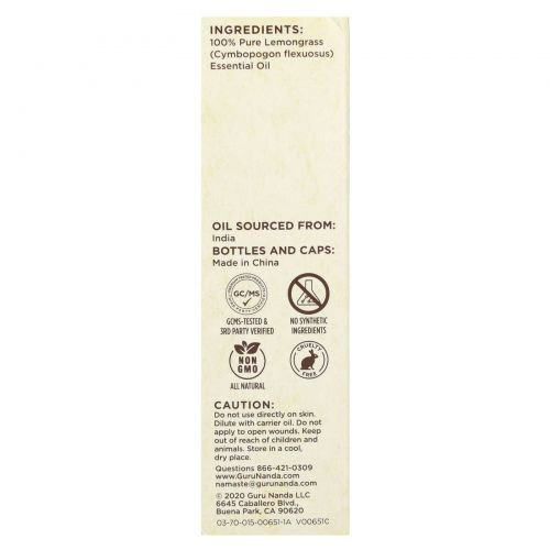 Описание товара GuruNanda, на 100% чистое и натуральное эфирное масло, лемонграсс, 15 мл (0,5 жидк. унции)