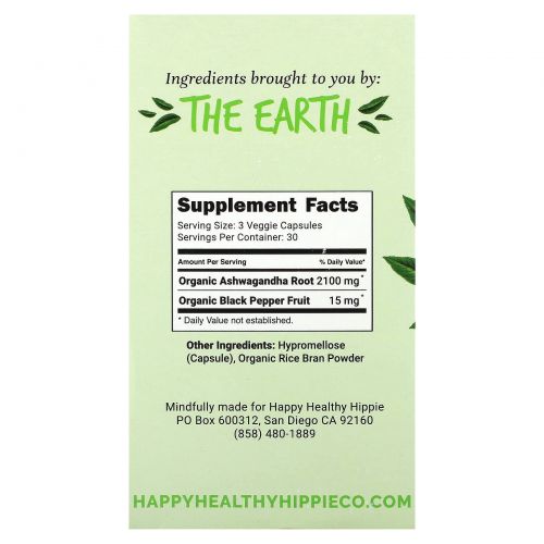 Описание товара Happy Healthy Hippie, Ашваганда, с повышенной силой действия, 2100 мг, 90 вегетарианских капсул