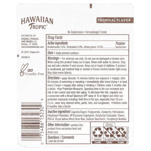 Описание товара Hawaiian Tropic, Солнцезащитный бальзам для губ, SPF 30, тропический, 4,25 г (0,14 жидк. унц.)