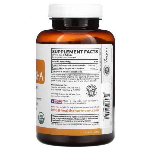 Корень - самая мощная часть растения, и это именно то, что вы найдете в органической ашваганде Healths Harmony, а также в органическом черном перце, который естественным образом увеличивает усвояемость.