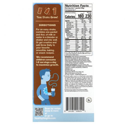 Описание товара Healthy Heights, Grow Daily, смесь протеина и питательных веществ, для детей от 3 лет, со вкусом шоколада, 7 пакетиков по 44 г (1,55 унции)