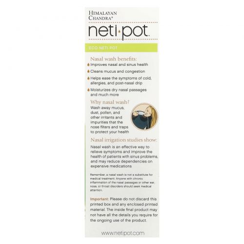 Экологичный чайник длительного использования Neti Pot производится из полностью натуральных возобновляемых ресурсов. Этот материал растительного происхождения (полимолочная кислота или PLA) не содержит нефтепродуктов и токсинов и потребляет на 65% меньше энергии по сравнению с традиционными материалами на основе нефти.