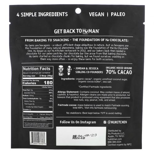 Hu Gems представляют собой шестиугольники — прочную и эффективную форму, распространенную в природе. Точно так же, как шестиугольники являются основой многих природных явлений, выпечка является основой шоколадной линии Hu. Путь бренда Hu начался в ресторане Hu Kitchen в 2012 году. В то время нашим пекарям понадобился шоколад для палео-выпечки. Наша линия шоколадных батончиков возникла на основе того шоколада для выпечки. Сначала Hu Gems были кусочками шоколада для выпечки, но мы стали перекусывать ими все чаще. Поэтому вы можете наслаждаться ими как в выпечке, так и в виде снеков.